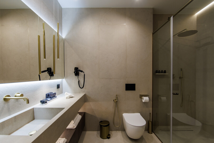 - Санузел: с душевой кабиной, туалетные принадлежности, фен