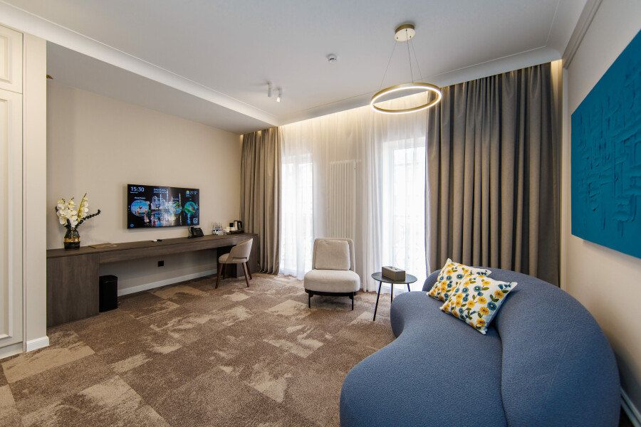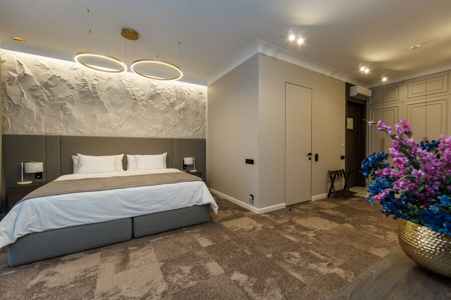 | Люкс 2-комнатный 2-местный | 58 кв.м. | 2 чел. | Мебель (вешалка, диван, зеркало, кровать двуспальная, прикроватные тумбочки, стол, стулья, шкаф), Об... | |